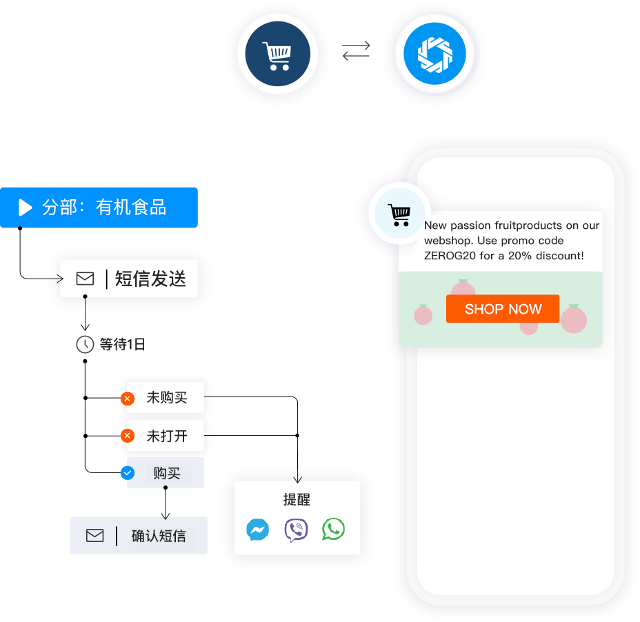 通过在正确的时间正确发送到客户偏爱的沟通渠道的自动化广告系列,使您的客户回到他们废弃的购物车中。
